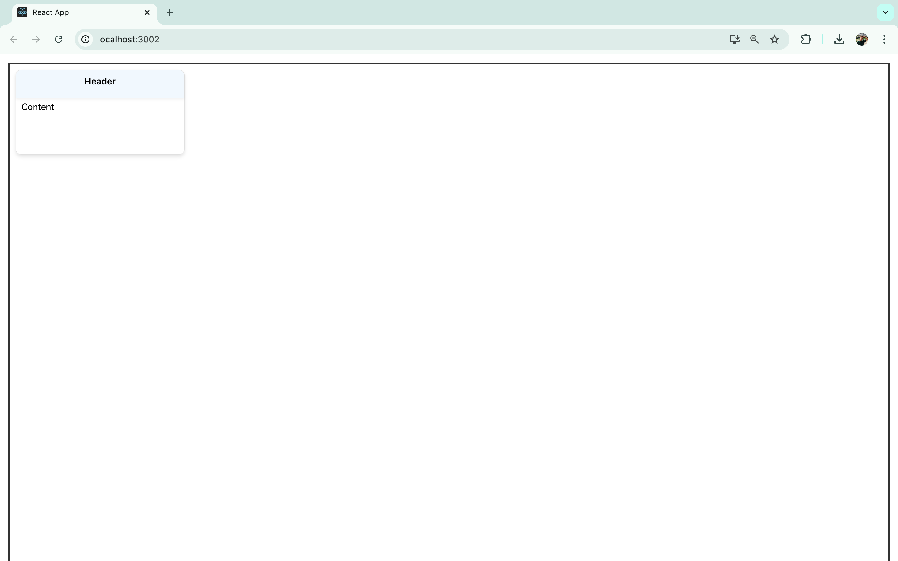 This snippet crafts a basic <Card> component with designated areas for a header and textual content. Initially, use placeholder text for these sections.