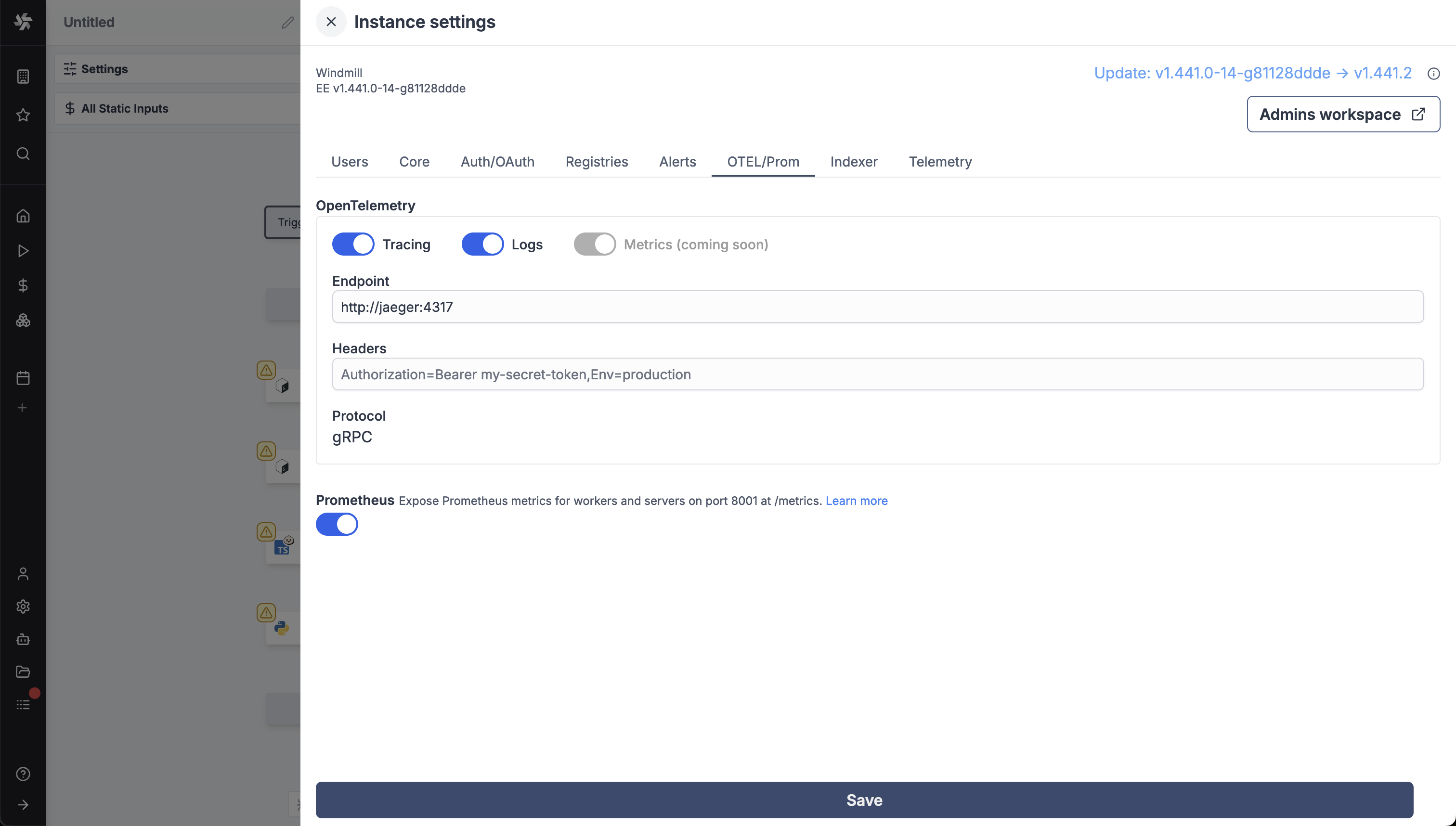From the instance settings, you can manually disable telemetry or "Send usage" to send usage data to Windmill and monitor it from the Customer portal.